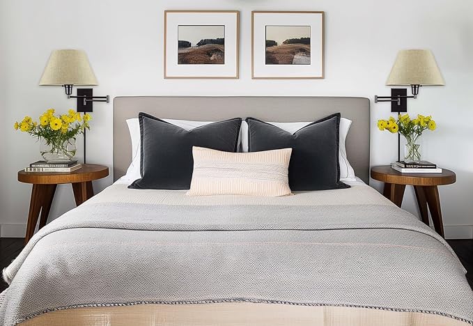 - [MODERN DESIGN] Set of 2 modern adjustable swing arm wall sconce embodies sophistication, showcasing a classy black finish to instantly upgrade your bedroom or living room. The modern wall light includes an empire tapered latte mocha fabric shade and (4) 12" cord covers to conceal cords & plug-in wire, casting a warm glow over its installed space, making it a prime choice amongst designers and builders