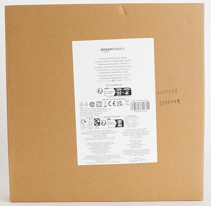 Amazon Basics Classic 12", Easy to Read, Silent Non Ticking, Battery Operated, Round Wall Clock, Black