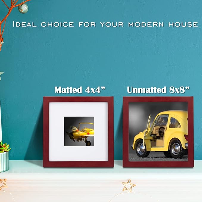 - SOLID WOOD - Square dark red frames 8x8 are made of premium quality solid wood. Fit 8x8 pictures without mat, 4x4/6x6 pictures with mats. Overall dimension is 9x9 inch. The wooden frame will be a long-lasting way to showcase your favorite memories.