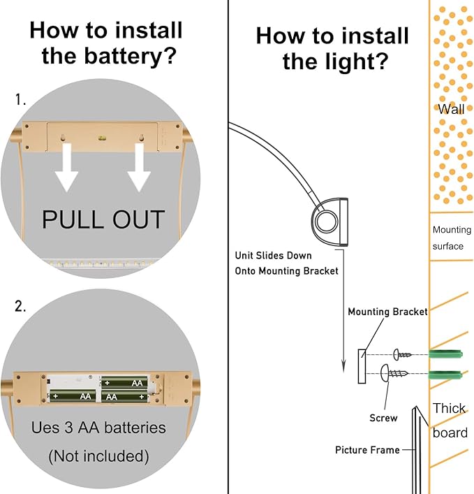 - Easy to install and Muti-purpose Art Wall Light: Screw in wall ,Use a built-in bubble level to make sure the mounting bracket is level. Perfect for dart ,wall artwork, gallery