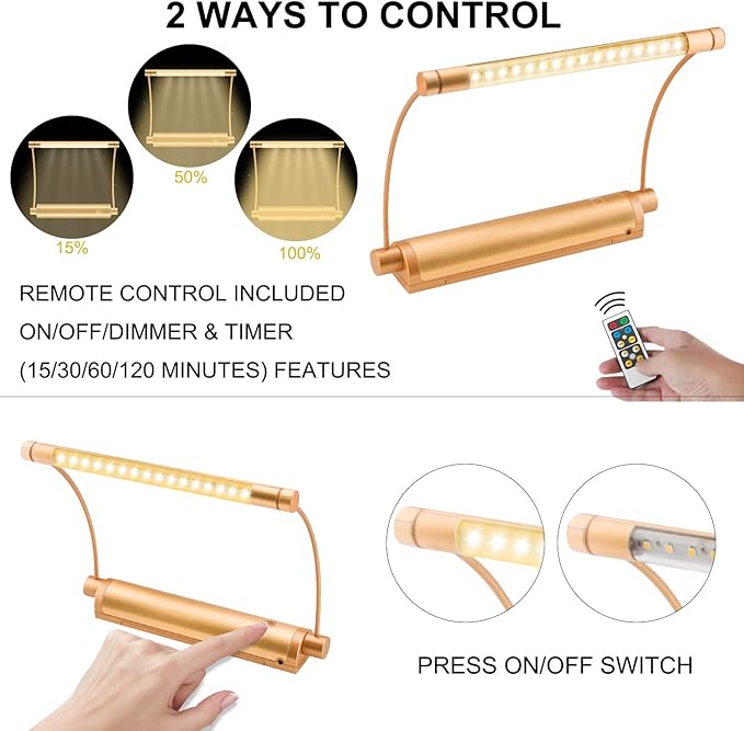 - Remote Controller Painting Light: Operated the lights within 10~13 feet . 2 ways to turn On/off by remote control and push switch button, 12 keys to adjust brightness level and set timer for illuminating artworks