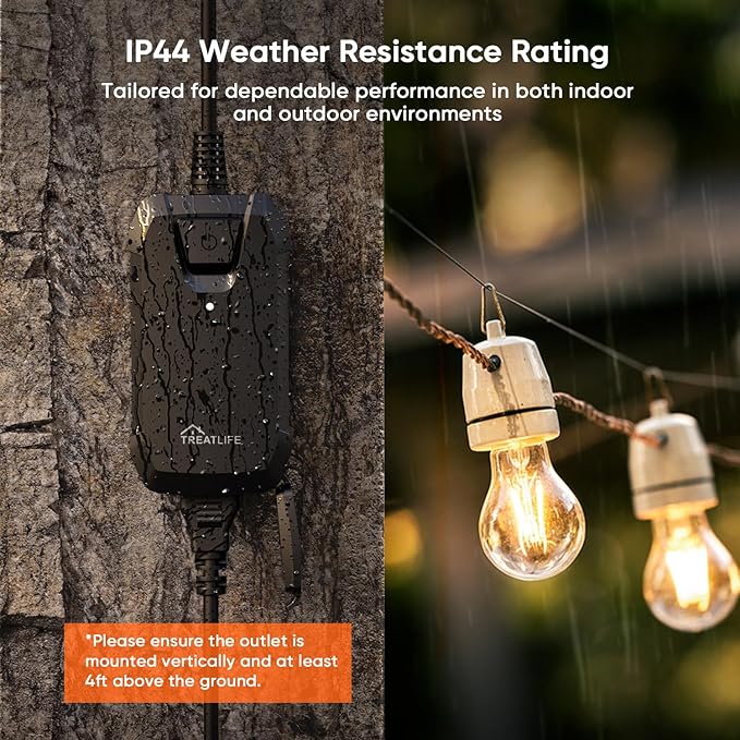 - No Hub Required & App Control: Easily control your outdoor dimmer for string lights without a hub. Just plug it into a 120V standard outlet and manage it remotely using the Smart Life or TreatLife app from anywhere, as long as your phone is connected to a 2.4GHz Wi-Fi network. Not compatible with 5GHz Wi-Fi. Wi-Fi range extends up to 300FT in open areas. This dimmer does not include a physical remote