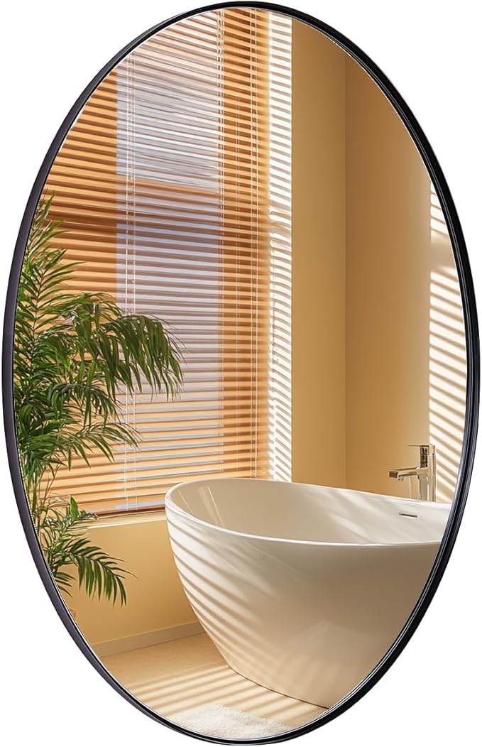 - Beautiful in Design: A slim, modern-inspired stainless steel frame embraces the oval mirror; its trendy matte black finish adds style; display it in your bathroom; effortlessly decorate your walls while bringing light and space into the room