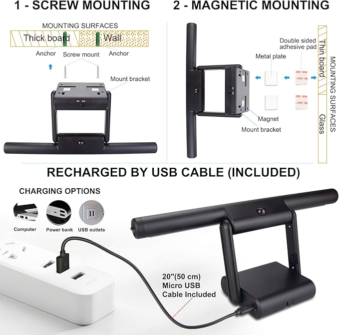 - ► [Easy Installation & Multipurpose]--Very easy to mount with provided screws, double-sided tape,magnets, metal plates (all included).The picture light is perfect for lighting up wall paintings, artworks, headboard pictures, mirror, dartboard, portraits, photos, poster, diplomas, bookcase displays, collections, jewelry display etc.