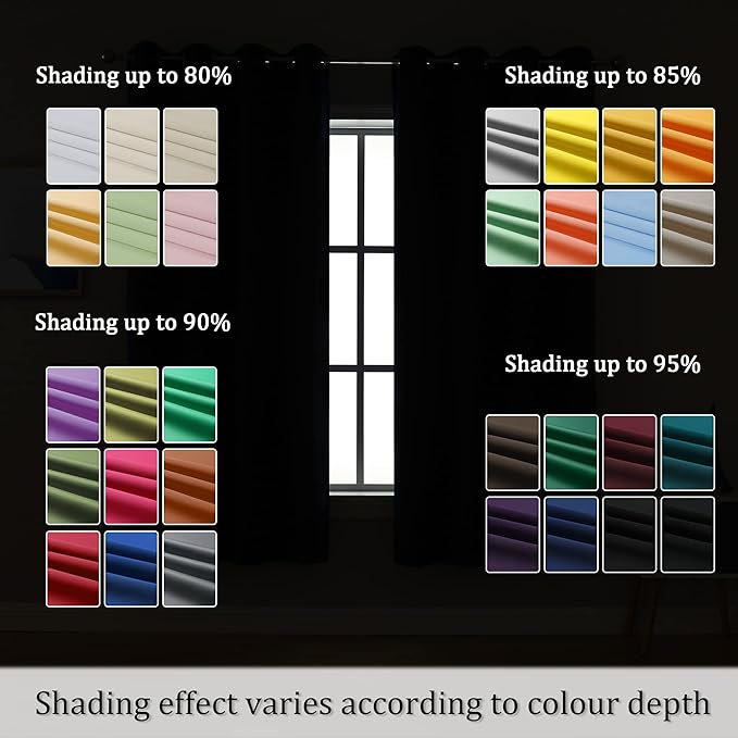 - Room Darkening Curtains:Made of high quality durable 100% polyester fabric.Blackout curtains to impede 85%-95%unwanted light and UV rays(Darker color curtains better shading effect).The front of the curtain is smooth textured silk look fabric,and the back is a homochromatic color material.