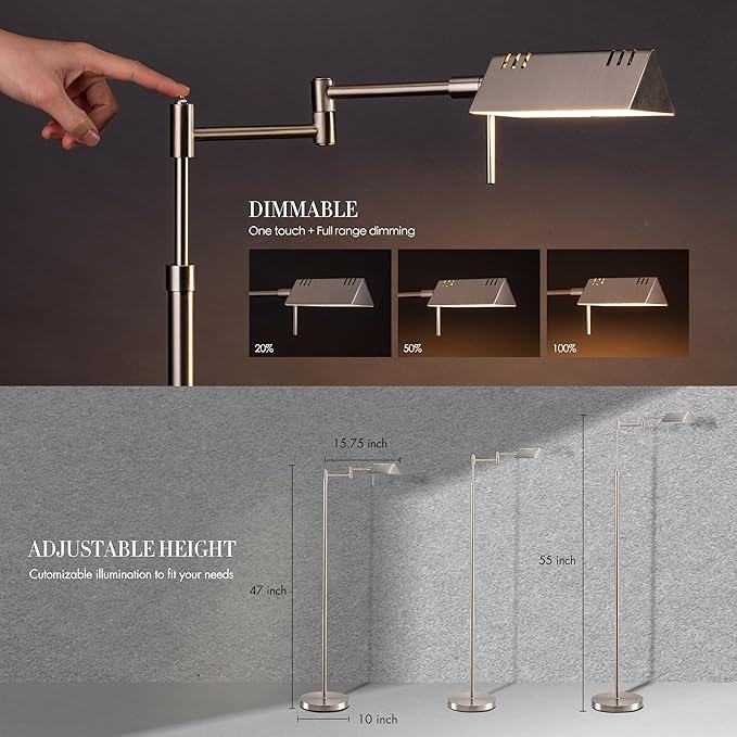 O’Bright Dimmable LED Pharmacy Floor Lamp, 12W LED, Full Range Dimming, 360 Degree Swing Arms, Adjustable Heights, Standing Lamp for Reading, Sewing, and Craft, ETL Listed, Brushed Nickel