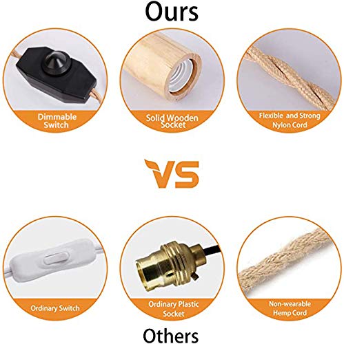 - 【E26/E27 Base Socket】The lamp cord kit is used thick nylon rope and the wood bulb connector is tightly connected,which is safe.and our cord is very light and can carry 44 lb,The hanging light kit fits standard E26/E27 bulbs, CFL bulbs and LED bulbs(bulb is NOT included),Max Wattage: 60W. Incandescent bulb max wattage 40W.Note: The dimming style does not support 85-265V wide voltage light bulbs.