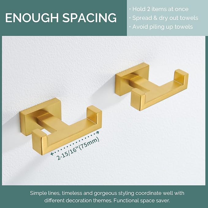 Angle Simple Double Towel Hook Brushed Gold 2 PCS, SUS304 Stainless Steel Bathroom Hand Towel Holder, Double Robe Hook for Wall