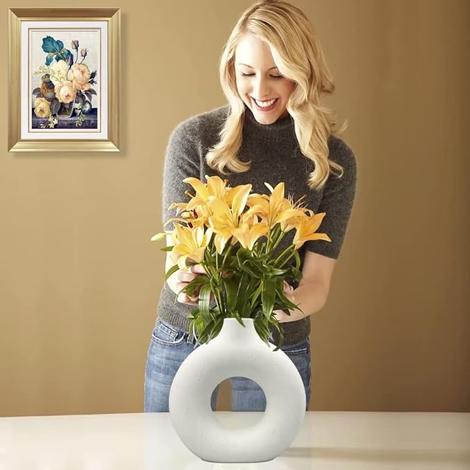 - 🌷【UNIQUE MODERN DESIGN 】– If you are tired of those dull and boring designs, then you will definitely be attracted by these beautiful hollow design white ceramic vases for home décor. The donut design makes the flower vases unique and stylish; you can see through the hollow out while enjoying beautiful flowers in the vase, which adds more romance and fashion to your house.