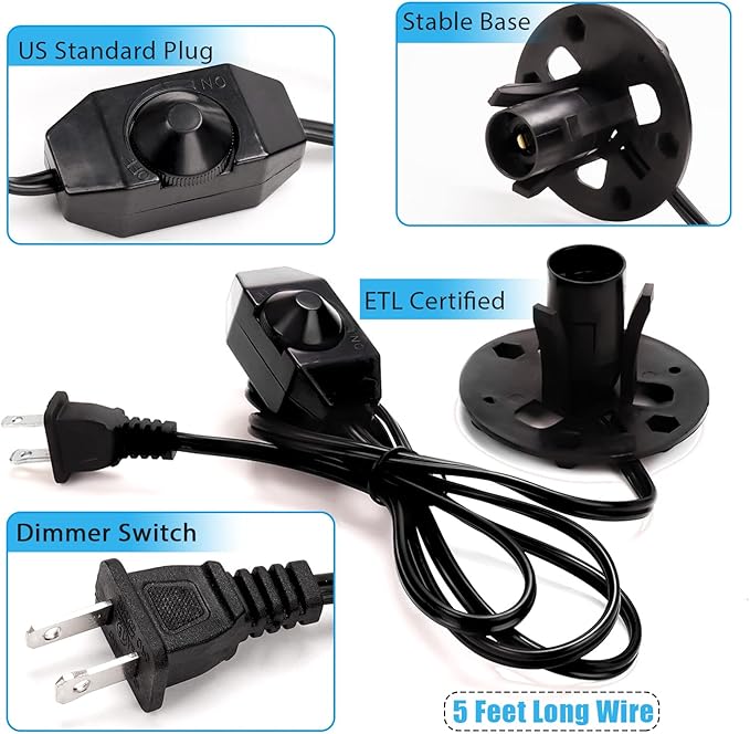 - 【2-Pack Salt Lamp Cord with Dimmer Switch】 5-foot-long Original Cord comes with a handy dimmer switch, which can help you adjust the brightness of the lamp. Specifically designed for salt lamps to hold any 15~25 Watt E12 light bulbs. Suitable for 110V, 2A, ≤200W current.