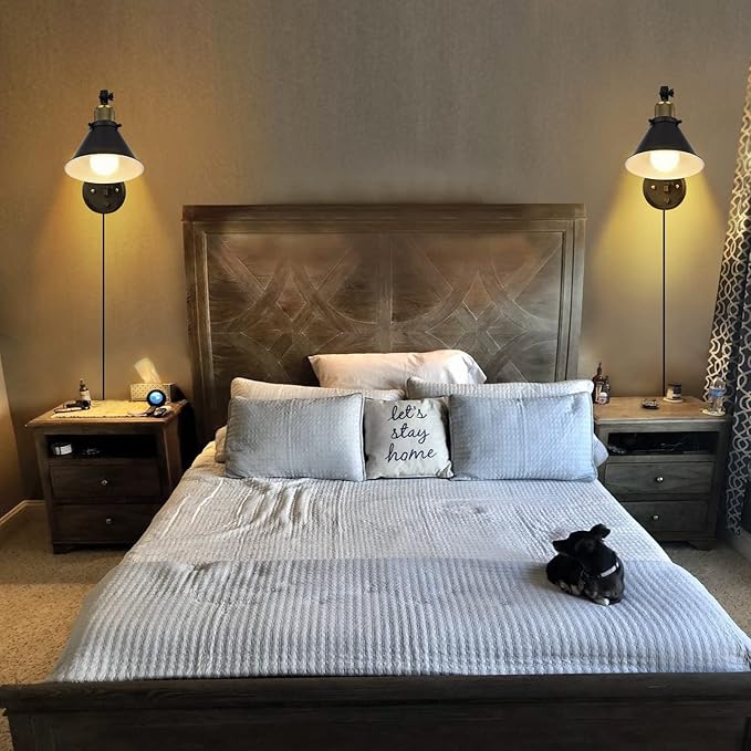 - Modern and Elegant Bedside Lights Plug in: Brass lamphead and black lamp body, Industrial Antique style wall lights. The color of the lampshade inside is white, light brightness won't be absorbed, so it will reflect brighter.