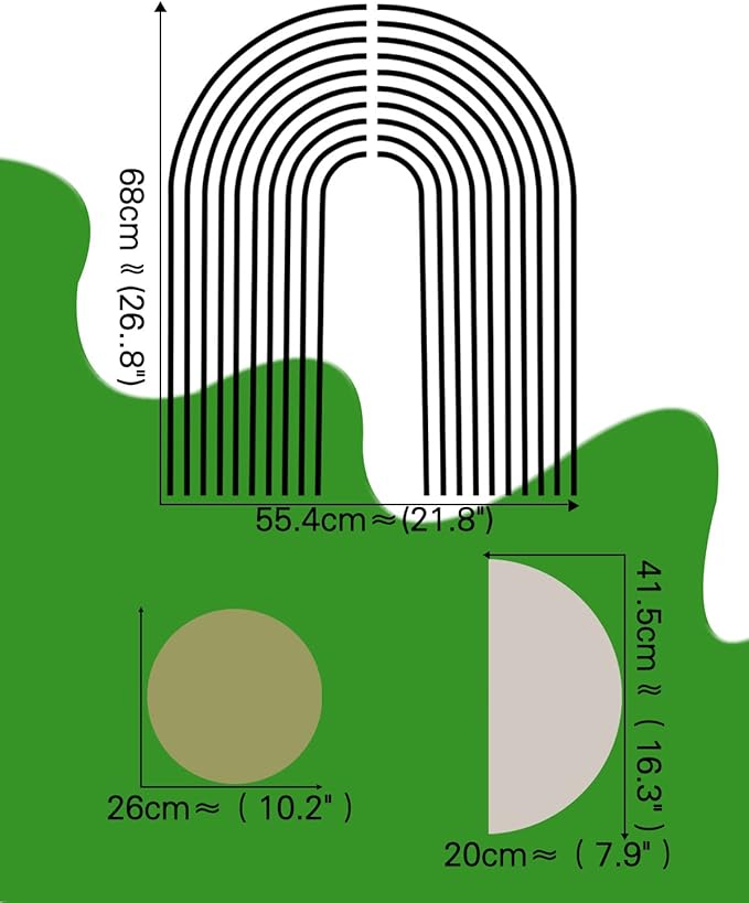 - Creative Arch & Circle Wall Decals - Include 3 sheet of wall decals. and the diameter of the arch is 21.8" W * 26.7" H; the diameter of circle is 10.2“;the diameter of semicircle is 16.3" and 7.9" H. The arch wall sticker decor makes your room more artistic, attractive and charming!