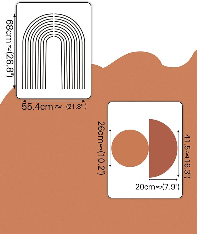 - Creative Arch & Circle Wall Decals - Include 3 sheet of wall decals. and the diameter of the arch is 21.8" W * 26.7" H; the diameter of circle is 10.2“;the diameter of semicircle is 16.3" and 7.9" H. The arch wall sticker decor makes your room more artistic, attractive and charming!