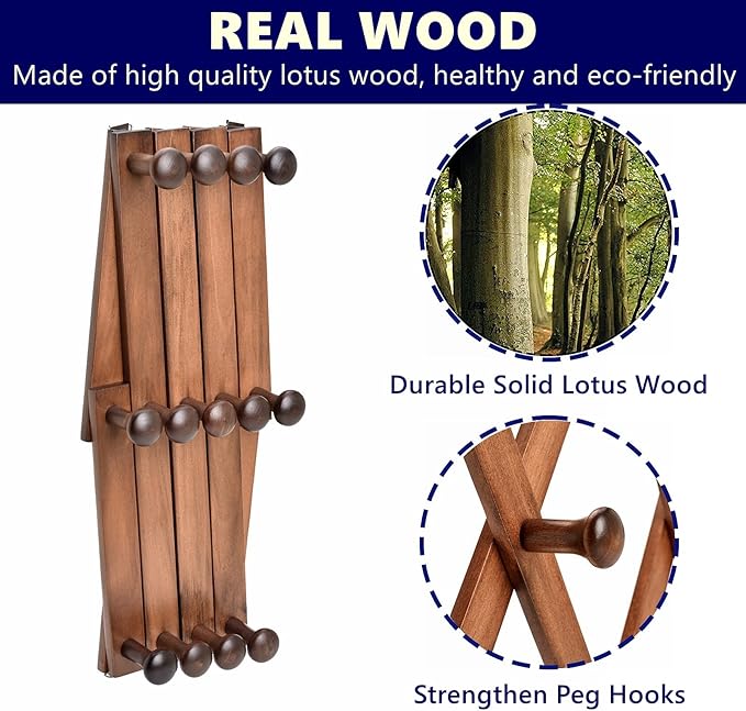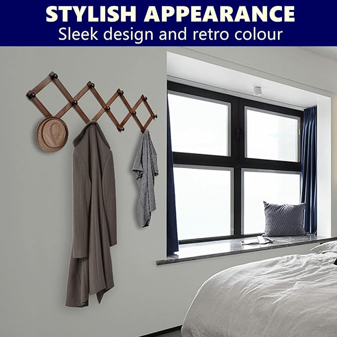 - 【Adjusts to Fit Your Space】The wood expandable coat rack is easily adjustable and can be hung horizontally or vertically; making them ideal for small spaces. Comes with 13 wooden pegs to keep your favorite items at hand and classic accordion wall hanger design that let you adjust the space between them. 16" high, extended up to 59" wide, 1.97" long pegs.