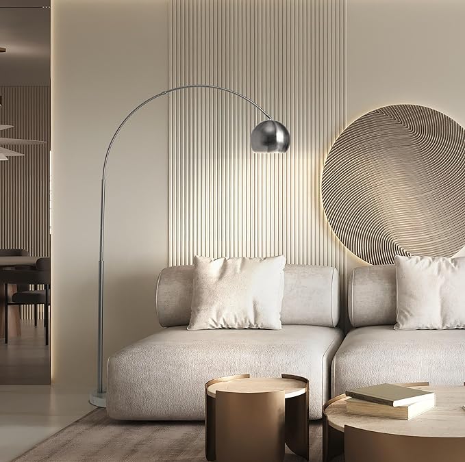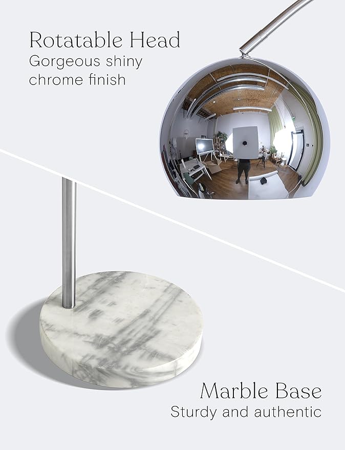 - Contemporary Arc Floor Lamp: The Brightech Olivia standing lamp comes with a 9” globe (aka “dome”) shade made from metal with a trendy chrome hue; this design works excellent with industrial, mid-century modern, and modern decoration themes. This arc-and-globe lamp shade and shiney chrome finish will elevate the level of elegance in your office and home, and your guests will not stop talking about it once they see it.