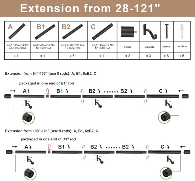 - PACKAGE INCLUDES: Our curtain rod 28-121" packed with 1 Inner rod (7/8" diameter, length: 38cm/14.96in), 8 Outer rods (1" diameter, length of each rod: 40cm/15.74in), 2 cap ends, 3 brackets, 1 set of screws & anchors and instructions. The splicing design allows the curtain to be pulled more smoothly without any fight. You can easily install curtain rod in just a few steps.