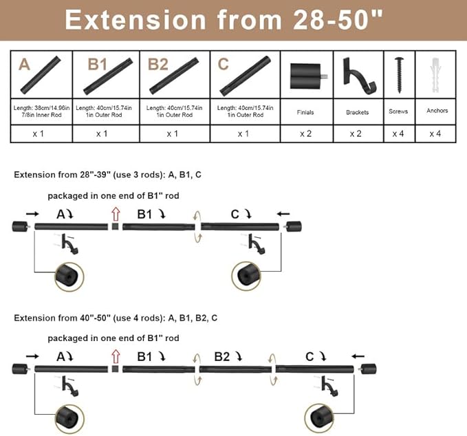 - PACKAGE INCLUDES: Our curtain rod 28-50" packed with 1 Inner rod (7/8" diameter, length: 38cm/14.96in), 3 Outer rods (1" diameter, length of each rod: 40cm/15.74in), 2 cap ends, 2 brackets, 1 set of screws & anchors and instructions. The splicing design allows the curtain to be pulled more smoothly without any fight. You can easily install curtain rod in just a few steps.