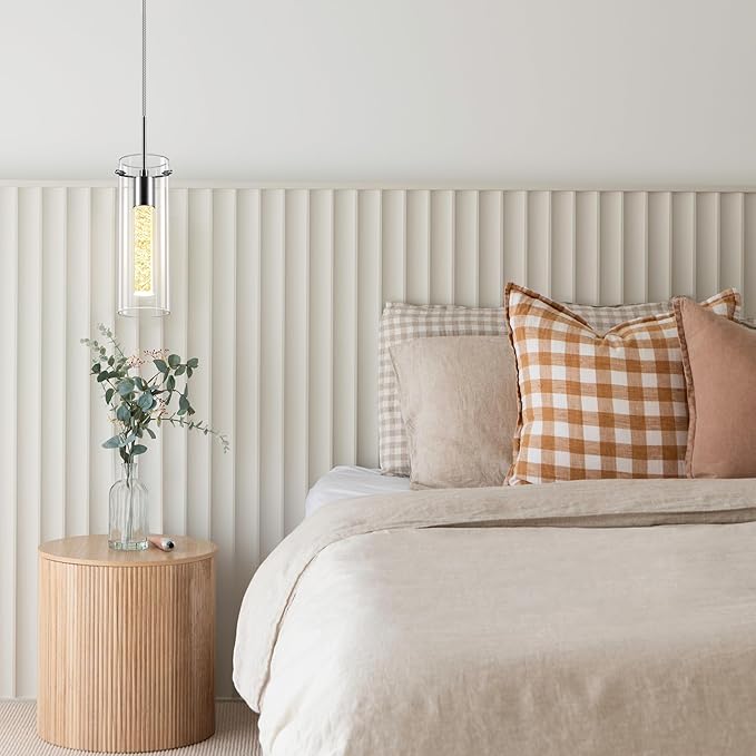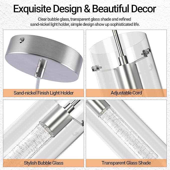 - Modern Design: Simple design line, graceful taste, Esfos pendant light is eye-catching and can suit almost all kinds of home styles. Brushed nickel finish, clear glass shade and mimicking champagne bubbles frozen in ice, this crystal pendant can create a modern charm glow to illuminate your house.
