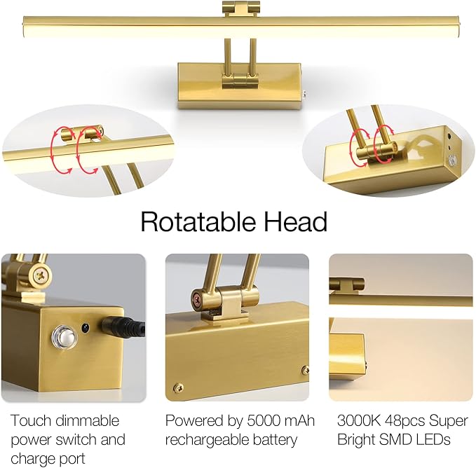 - Full Metal Picture Light: Made of metal and Aluminum, 48pcs LEDS,3000K warm white, 5000mAh rechargeable battery included,300 Lumen