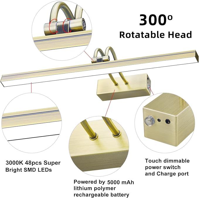 FUNCHDAY Picture Light, Wireless Rechargeable Gallery Lights with Remote, 280LM 48 LED Dimmable Painting Lighting, 16in Battery Operated Art Lights for Paintings,Wall Artwork (Antique Brass)