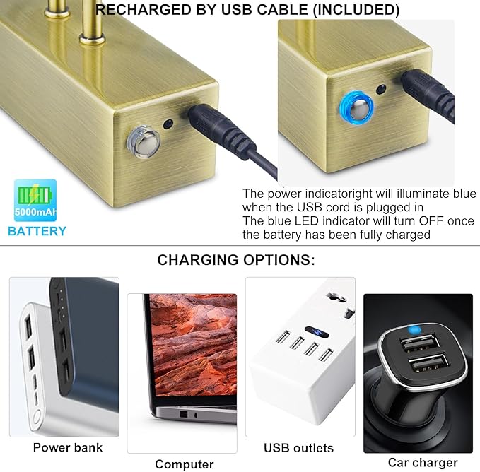 - Rechargeable Wall Lights - The battery operated picture light is built-in 5000mAh lithium battery. Take lamp down then recharge it with included USB cable. 6-7 hours full charging supports lighting up 10 hours.