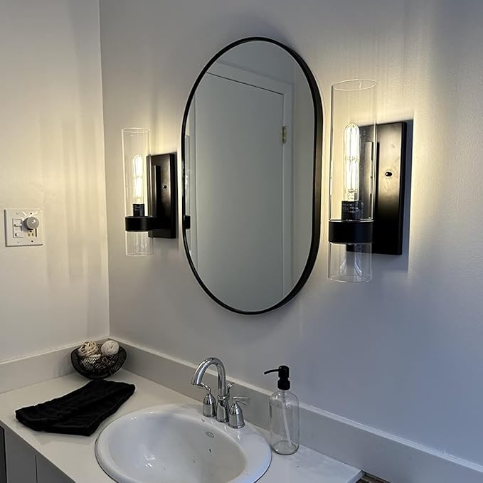 - Cleanlined Design: Clean and Simple, the bathroom light fixture’s canopy, arm, lamp holder and candle cover are dressed in a hand-painted black finish, adding an industrial-inspired charm to your living space. It is characterized by an elongated cylinder shade crafted from clear glass. The shade is designed to house a tube bulb to complete the aesthetic.