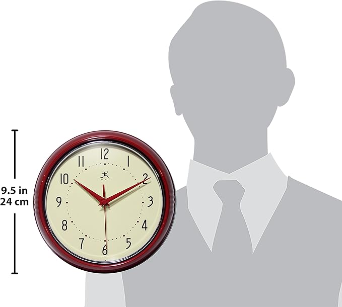 Infinity Instruments LTD. Retro 12 inch Silent Sweep Non-Ticking Mid Century Modern Kitchen Diner Wall Clock Quartz Movement Retro Wall Clock Decorative (Red)