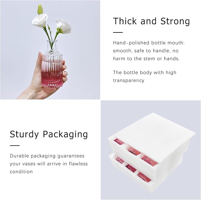 - SAFE & SECURE PACKAGING: Your satisfaction is our priority! To ensure these mini vases reach you in perfect condition, we have specially designed packaging. Each vase is carefully wrapped in thick Styrofoam boxes, to avoid breakage in transportation. If you receive a damaged vase, reach out to us immediately.