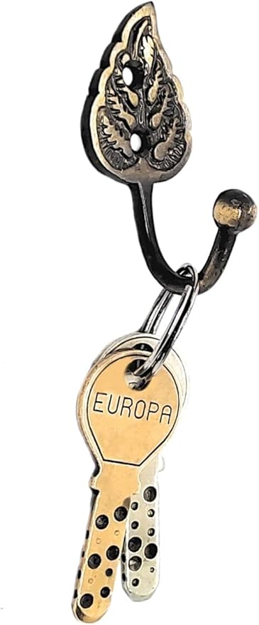 Multipurpose Hooks, Used to Hang Clothes, Bags, Coats, Curtain Hold Backs, Keys, Colour - Antique Gold, Material - Brass, Leaf Design, Screws and Wallplugs Included, Pack of 4 Pieces