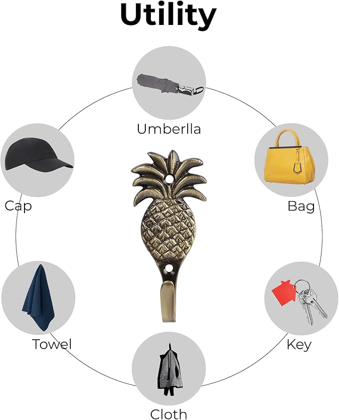 Multipurpose Hooks, Used to Hang Clothes, Bags, Coats, Curtain Hold Backs, Keys, Colour - Antique Gold, Material - Brass, Pineapple Design, Screws and Wallplugs Included, Pack of 2 Pieces