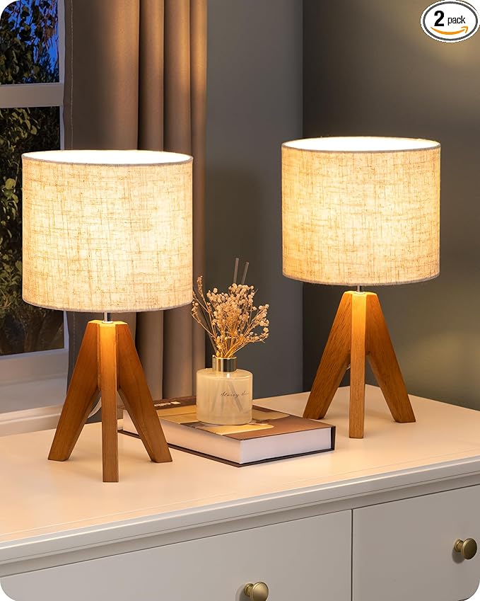 EDISHINE Small Table Lamp, Wooden Tripod Bedside Lamp with Linen Fabric Lampshade, 14.2" Nightstand Lamp for Bedroom, Living Room, Office, 2 Pack