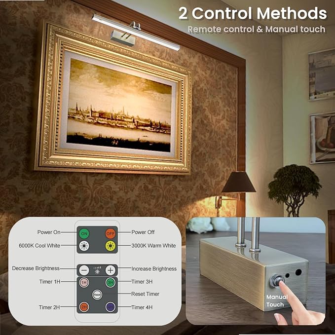 - Timer Preset Painting Lights for Wall Cordless - Press the timer button on remote control to set the gallery wall light to turn OFF automatically in 1,2,3,4 hour to save battery energy.