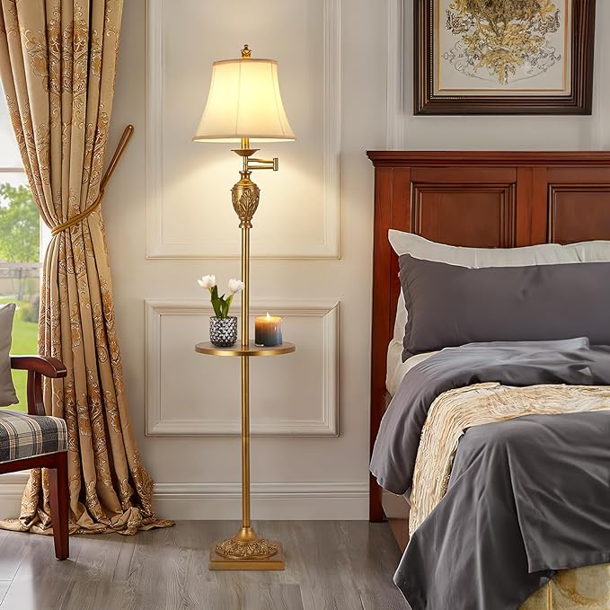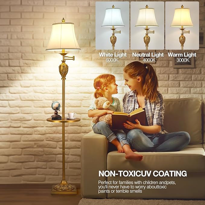 - TABLE AND ELEGANT LAMPSHADE-- We upgraded the Lamps,The middle part of the floor lamp has added a tray for you to place your belongings, or put a cup of coffee in the leisure time is also good. The lampshade is made from durable faux silk fabric, which makes the light soft, eye friendly and is easy to clean.
