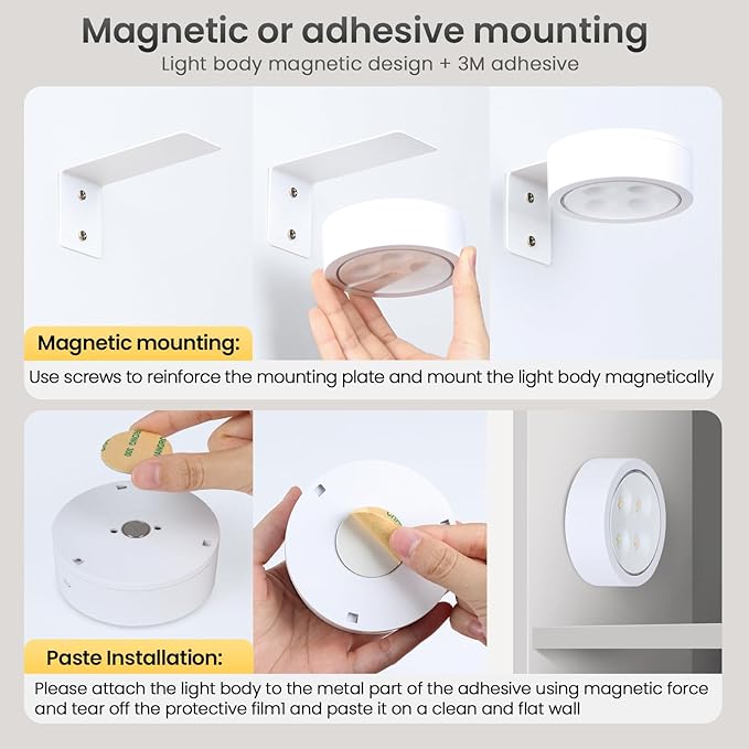 - 【Easy to Install】This LED wall lights comes with a magnetic fixture and strong 3M adhesive. The package comes with all the necessary accessories for installation, you just need to use the expansion screws to fix the iron plate on the wall and then use the magnetic hockey puck light to fix it on the iron frame, it is very easy to use.3M adhesive can be used in cabinets or closets!