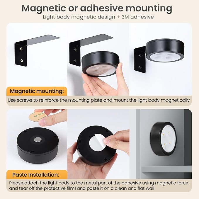 - 【Easy to Install】This LED wireless led picture light comes with a magnetic fixture and strong 3M adhesive. The package comes with all the necessary accessories for installation, you just need to use the expansion screws to fix the iron plate on the wall and then use the magnetic hockey puck light to fix it on the iron frame, it is very easy to use.3M adhesive can be used in cabinets or closets!