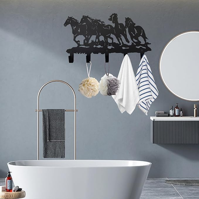 Metal Horse Coat Hooks Wall Art Decor-Horse Hangers and Key Holder-Clothes Rack and Backpack Hanger-Coat Hooks Home Decor for Storage, Living Room, Hallway, Office (Black)