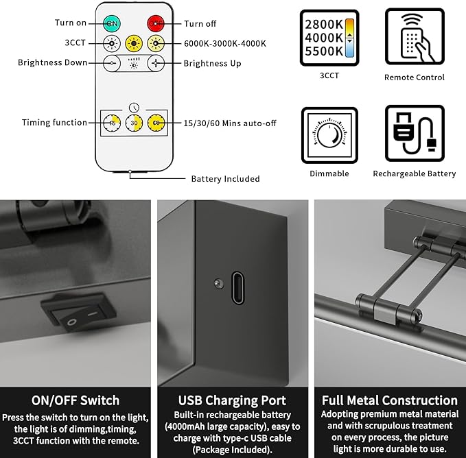 - 3CCT Dimmable with Remote: Picture frame light allows you to set timer options, light tone, and brightness. Operated with 15/30/60 minutes auto-off timer function, the picture lighting is 3CCT-3000K/4000K/6000K(Warm /Natural/White light) adjustable, 5%-100% brightness dimming range to meet your needs.