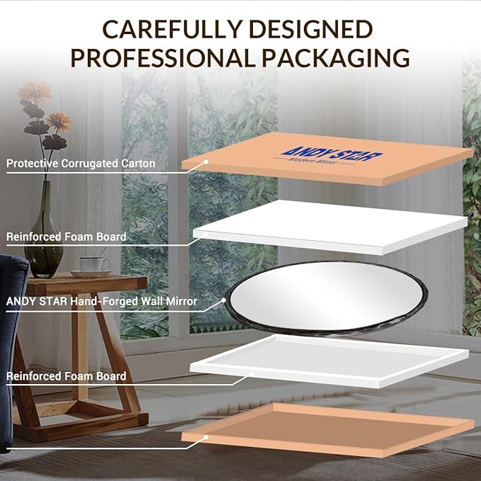- Thoughtful Packaging & Service: Two pre-installed D-rings on the backboard and included high-strength adjustable suspension accessories allow you to hang this living room rounded mirror. Carefully designed packaging ensures that this home decor is handed over to you in perfect condition. With more than 20 years of experience in manufacturing high-end black metal circular mirror, we insist that quality always comes first