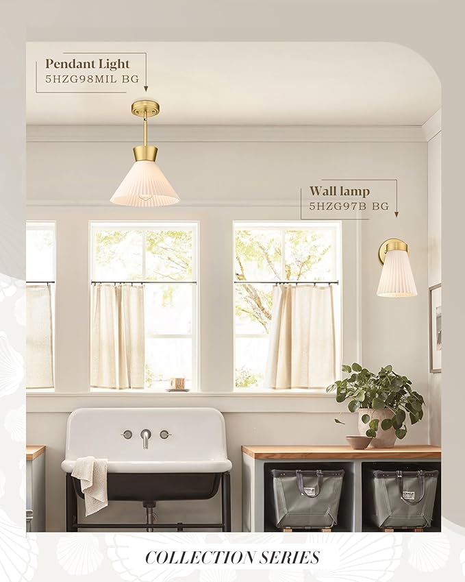 - 【Modern Design】The design of this wall light fixture is inspired by the white seashell. Brushed brass metal base carrying one frosted milk-white striped glass shade to enhance the beauty of luxury and elegance!