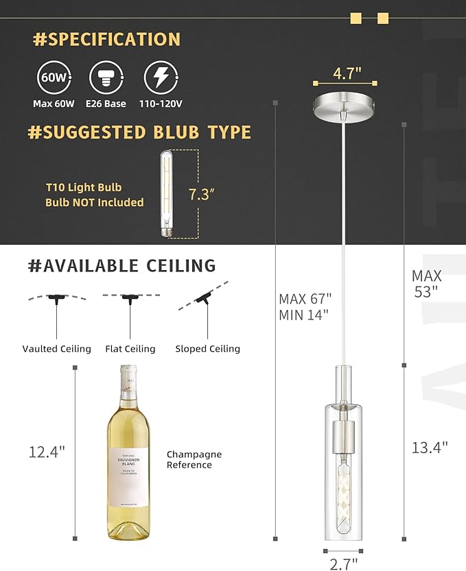 - 【Product Dimensions】Lampshade: 2.7" x 13.4" (Dia x H). Length of the cylinder glass: 10.2". Ceiling plate: 4.7" x 1" (Dia x H) Adjustable wire cord: 53". Max length of the pendant lighting is 67". Min is 14". This vintage kitchen pendant lighting over island can be used on a flat, sloped or vaulted ceiling.