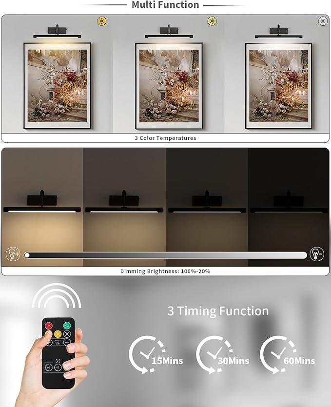 - 3CCT AND DIMMABLE:This Wireless Picture light is with led light source and 3CCT different lighting options, dimming the battery operated picture light to your needs.Whether you want a soft glow or bright light.