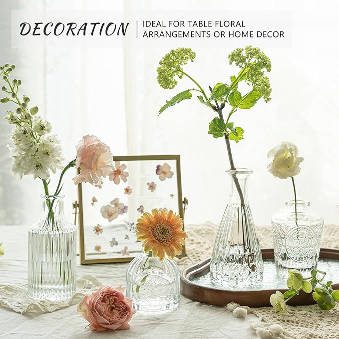 - ELEGANT VINTAGE STYLE: This set includes 5 clear glass bud vases, each adorned with delicate etched patterns for added charm. These flower vases boast a classy vintage design, suitable for any occasion, from casual to formal. Spruce up your window sill, dining table, or wedding reception with these beautiful vintage décor vases, creating an elegant centerpiece that will captivate all who see them.