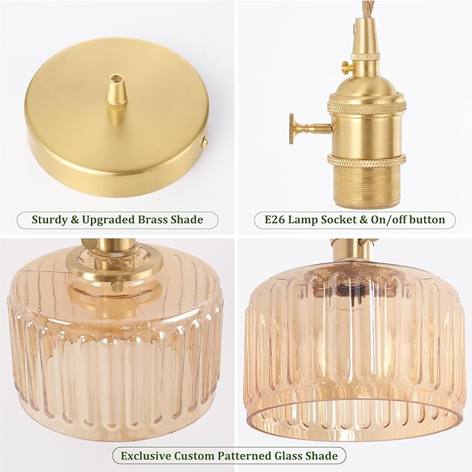 Pendant Light with Amber Striped Glass Lmapshade, Brass Vintage Pendant Light Adjustable Hanging Light for Kitchen Island Dining Room Hallway