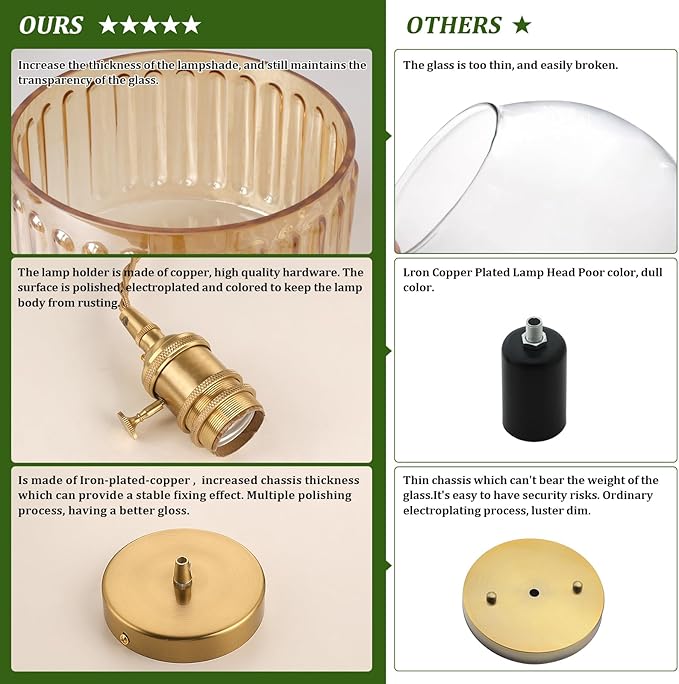 - 【High Quality Materials】The glass is carefully selected and treated to ensure that it is brightly coloured and uniform, without blemishes. The metal parts are made of corrosion-resistant and oxidation-resistant materials, presenting an elegant sheen and texture. And the wire is wrapped in a rubber coating with fabric covering for safety and reliability.