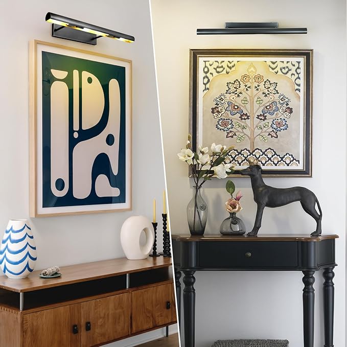 - 1.5mm Thickened Metal: The full body and base of this Hardwired Picture Light is made of durable high quality metal, more thickened than others on market, enhancing the overall texture and aesthetic of the Black Art Light for Wall while offering excellent durability and safety. This Black Picture Frame Light is suitable for wall paintings, picture frames, posters spanning 20-40 inches in width, a reliable choice for gallery lights and art lights.