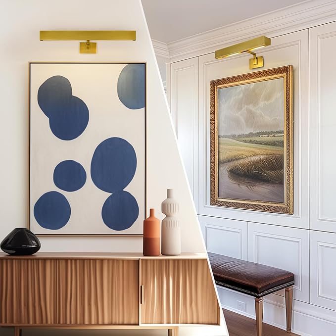 - 【Unique Design & Premium Material】Handmade brushed Gold crafted picture lights for wall is made of anti-rust, anti-corrosion pure thick metal, enhancing the overall texture and aesthetic while offering excellent durability and safety. The adjusting screw of art light can not only easily adjust the angle of the lampshade, but also will not loosen after long-term use. The bathroom vanity light features a unique design that is elegant & distinctive, making the gallery lights fit into any interior style and add a fantastic artistic sense to your space.Perfect for bedroom, living room, hallway, doorway, bathroom, etc.