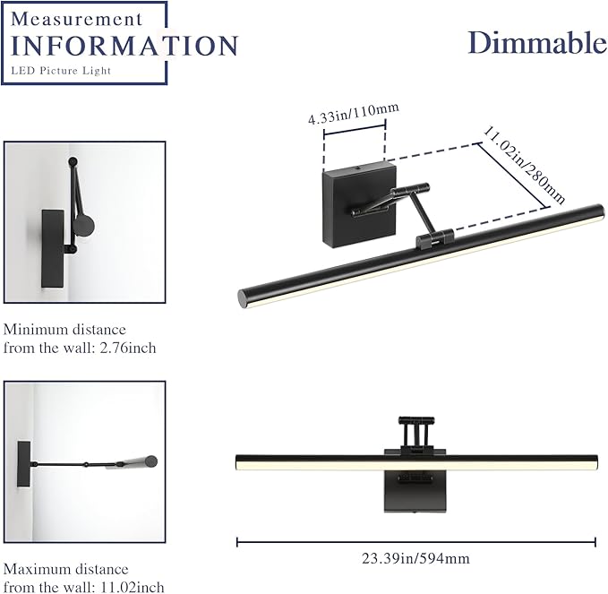 - Dimmable Function: Black picture light with ETL certificated dimmable driver ensure the vanity lamp to 5%-100% dimming range, the dimmable art light compatible with most household triac LED dimmers for smooth and flicker-free operation.you can switch the wall picture light freely to the dimming range