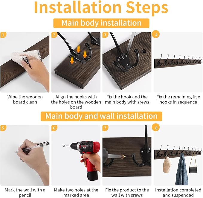 - Easy to Install: There are pre-drilled mounting holes on the coats rack(notice: the big screw hole is front, please use a 6mm drill bit), first install the hooks to the board front, then install the coat rack to the borad or the wall