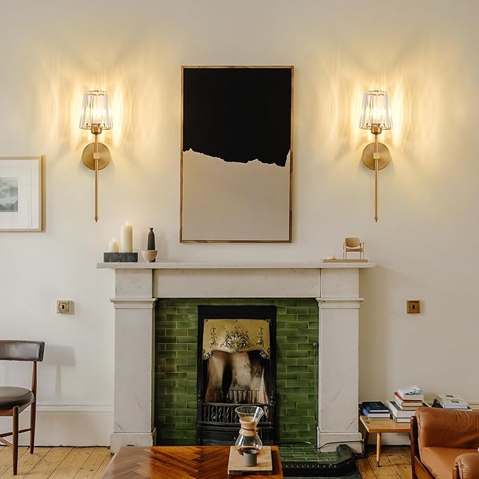 - Crystal Wall Sconces: Clear crystal wall sconces sets of 2 are made of sturdy metal with a classic brushed brass gold finish and a finial at the end of the horizontal bar and crystal shades. The details on this sconce are what stand out. The crystal design is amazing. Its crystal shade is sparkle and glamour. When the light is on, it looks like frozen champagne, creating a captivating visual effect, compared to traditional fabric shade, our crystal wall lights look more elegant