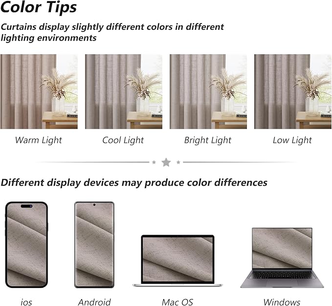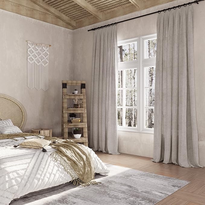 - Light Filtering & Airy: Beautifully frames your windows with a soft and hazy vision. Linen textured curtain draperies don't completely block the sunlight but gently filtering out harsh sunlight. The open weave lets in plenty of fresh air when you have the curtains closed but window open